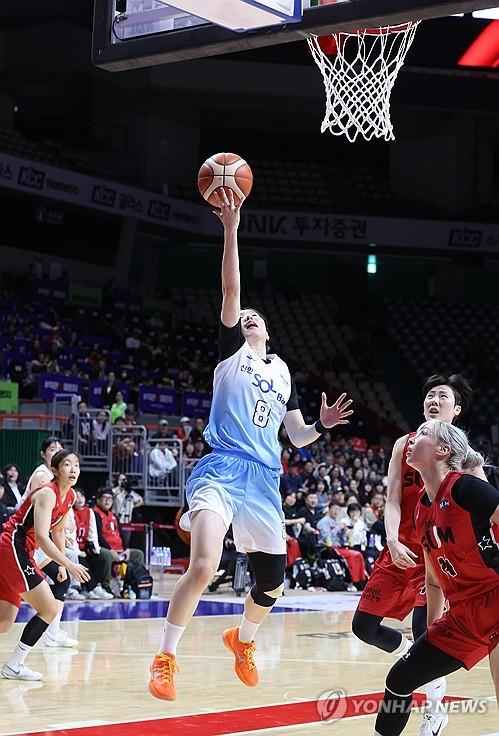 (부산=연합뉴스) 강선배 기자 = 16일 부산 사직실내체육관에서 열린 2025~2026시즌 여자프로농구 정규리그 개막전, 부산 BNK 썸과 인천 신한은행 에스버드의 경기. 신한은행 김지영이 하고 있다. 2025.11.16
