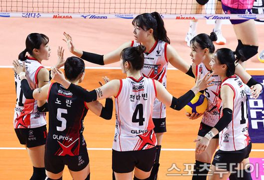 [스포츠투데이 팽현준 기자] 16일 인천 삼산월드체육관에서 열린 V리그 여자부 흥국생명과 정관장의 경기, 정관장이 득점하고 있다. 2025.11.16. [스포츠투데이 팽현준 기자 sports@stoo.com]