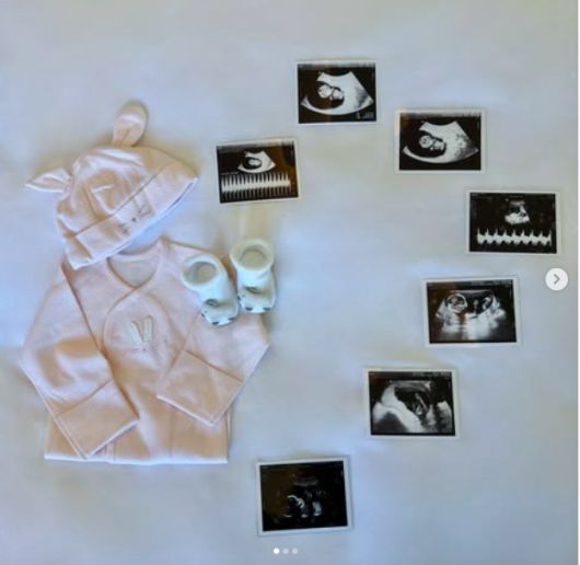 사진에는 은가은이 태어날 2세의 귀여운 옷과 양말, 모자와 함께 초음파 사진을 나열해 놓은 모습이 담겼다. 이어 그는 초음파 사진 앞에 만삭의 배를 공개하며 아름다운 D라인을 자랑했다. 이에 남편 박현호는 “사랑해요 우리가족♥”이라고 애정을 표했다.