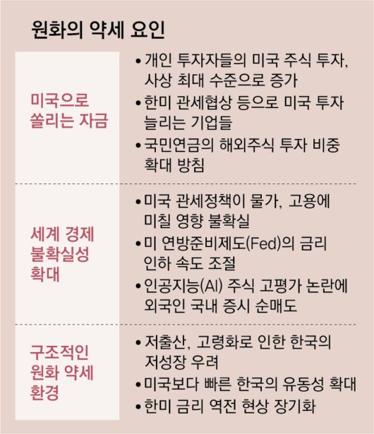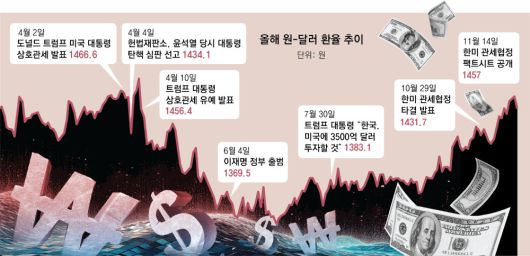 한미 관세 협상의 세부 작업이 막바지였던 11월 초 보름 동안 원-달러 환율이 다른 주요국 통화들에 비해 유독 많이 오른 것으로 나타났다. 올해 들어 연평균 환율은 국제통화기금(IMF) 외환위기 직후인 1998년 평균 환율(1394.97원)을 넘어서 사상 처음 1415원대에 올라섰다. 미국 주식을 사들이는 ‘서학개미’들과 미국에 투자하는 기업들이 늘어 원화 대신 달러화를 찾는 수요가 증가한 영향으로 풀이된다. 미국 기준금리 인하 기대가 옅어지며 투자자들은 안전자산인 달러를 더 사들이고 있다.