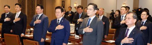 이재명 대통령이 16일 용산 대통령실에서 재계 총수들과 한미 관세협상 후속 과제를 논의하는 민관 합동회의를 개최했다. 이 대통령은 한미 관세협상 타결 과정에서 보여준 재계의 역할에 감사를 표하면서도 대미 투자 확대로 국내 투자가 줄어들지 않도록 각별한 관심도 당부했다. (앞줄 맨 왼쪽 두 번째부터) 정기선 HD현대 회장, 최태원 SK그룹 회장, 이 대통령, 이재용 삼성전자 회장, 여승주 한화그룹 부회장, (뒷줄 맨 오른쪽부터) 김정관 산업통상부 장관, 구광모 LG그룹 회장, 정의선 현대차그룹 회장, 서정진 셀트리온 회장. 왕태석 선임기자