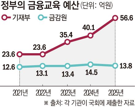 기획재정부의 관련 예산도 비슷한 양상이다. 기재부는 지역경제교육센터운영 예산을 통해 경제·금융교육을 집행하고 있다. 2020~2022년 23억6400만 원으로 3년간 동결된 이후 2023년 35억4000만 원, 2024년 40억1200만 원, 2025년 56억6200만 원으로 늘었다. 하지만 같은 기간 금융교육 전담 프로그램이나 신규 사업은 거의 없었다. 금융교육을 강화하기 위한 예산 증액으로 보기 어렵다는 주장이 설득력을 얻는다.