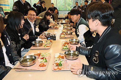 (서울=연합뉴스) 이정훈 기자 = 김민석 국무총리가 17일 '천원의 아침밥'을 제공하는 서울 종로구 성균관대학교 은행골식당에서 식사하며 학생들과 대화하고 있다. 2025.11.17