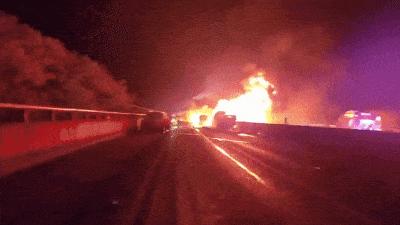 이어 14t 화물차가 사고 탱크로리 차량 뒷부분을 추돌하는 등 뒤따라오던 2.5t 화물차와 승용차, 버스 등 차량 8대가 추가로 추돌했다. 이 사고로 탱크로리와 14t·2.5t 화물차 2대 등 차량 3대에서 불이 났다. 버스 승객 20여명은 다행히 다치지 않았다.