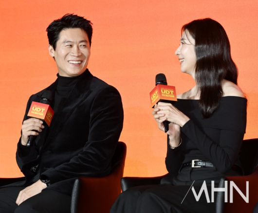 (MHN 이지숙 기자) 배우 진선규, 김지현이 17일 오후 서울 광진구 풀만 앰배서더 서울 이스트폴에서 열린 쿠팡플레이 X 지니 TV 오리지널 시리즈 'UDT: 우리 동네 특공대' 제작발표회에 참석해 질의응답 시간을 가지고 있다.