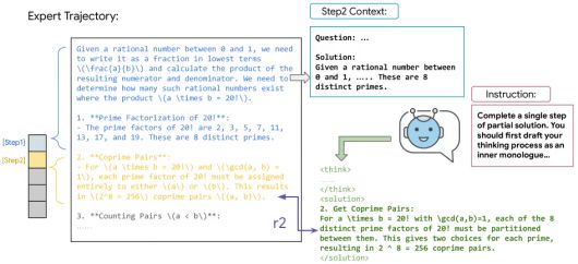 SRL에서는 전문가가 문제를 푸는 과정을 의미 있는 단계별 행동으로 나눈다. 예를 들어, 수학 문제에서는 대수를 계산하는 것이 하나의 행동이 될 수 있고, 소프트웨어 에이전트에서는 코드 저장소에서 명령을 실행하는 것이 하나의 행동이 된다. 모델을 학습하기 위해 SRL은 강력한 교사 모델을 사용해 문제 해결 경로(solution trajectory)를 미리 만들어, 이를 소형 모델 학습에 활용한다.