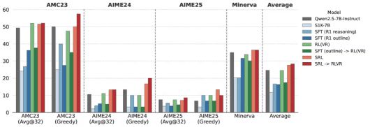 연구진은 SRL의 효과를 검증하기 위해 '큐원2.5-7B-인스트럭트'를 난이도 높은 1000개 수학 문제 데이터셋으로 미세조정했다. 이후 SFT와 RLVR 기반 모델과 비교한 결과, SRL 학습 모델은 평균 3.0% 성능 향상을 기록했다.