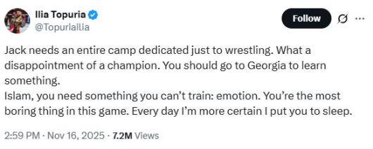 이어 마카체프에게 향한 발언은 더욱 수위가 높았다. 토푸리아는 "이슬람, 너에게는 훈련으로 얻을 수 없는 것이 필요하다. 바로 '감정'이다"라며 "너는 이 스포츠에서 가장 지루한 존재다. 나는 너를 잠재울 거라는 확신이 날마다 더 커지고 있다"라고 적었다.