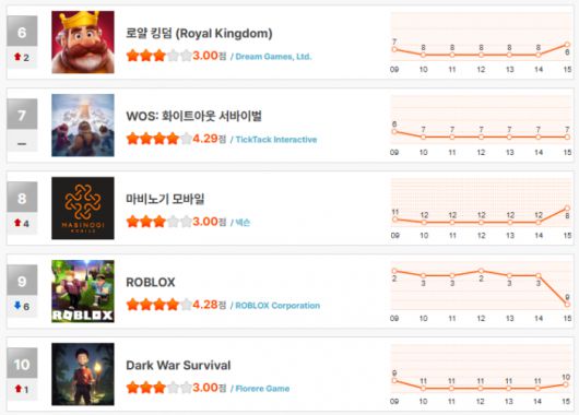 중위권에서는 ‘WOS: 화이트아웃 서바이벌’과 ‘로얄킹덤’이 서로 순위를 바꿔 각각 6위·7위에 올랐고, 지난주 11위까지 내려갔던 ‘마비노기 모바일’이 반등에 성공하며 8위로 랭크됐다. 반면 어린이·청소년층에서 절대 강세를 보여온 ‘로블록스’는 2위에서 무려 9위까지 주저앉으며 극심한 롤러코스터 흐름을 보였다.