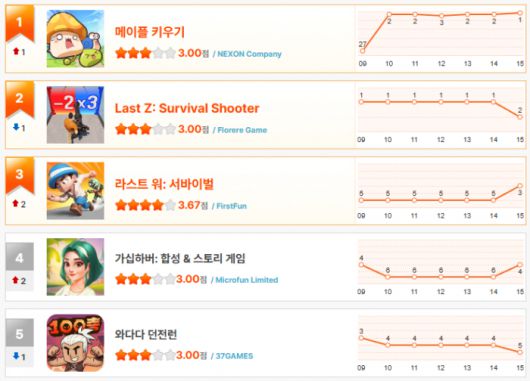 11월 2주차 랭킹은 그야말로 ‘메이플스토리 IP의 저력’이 시장을 뒤흔든 한 주였다. 넥슨이 11월 6일 글로벌 정식 출시한 신작 ‘메이플 키우기’가 단숨에 시장의 중심으로 떠오르며 차트 진입 불과 5일 만에 1위를 차지했다. 지난주까지 ‘라스트Z: 서바이벌 슈터’와 ‘와다다 던전런’, ‘로블록스’ 등이 엎치락뒤치락 하며 혼전 양상을 보였던 상위권 판도가 완전히 뒤집힌 것이다.