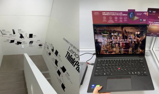 이번 팝업스토어에서 가장 눈에 띄는 부분 역시 AI PC 체험 공간이었다. 팝업스토어 입구에서 레노버 제품들의 발전 역사가 그려진 계단을 올라 2층에 들어서면 제품 체험존이 펼쳐진다. 이곳에서는 주요 제품인 '씽크패드'와 게임에 특화된 '리전', 영상 제작 맞춤형 '요가' 등 다양한 라인업의 PC와 태블릿, 악세서리 등을 만나볼 수 있다. 그중 초슬림 노트북 '씽크패드 X1 카본 G13 아우라 에디션'이 눈에 띄었다.
