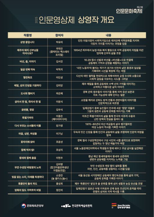 문화체육관광부와 한국문화예술위원회는 11월 20일부터 11월 21일까지 한국영상자료원 시네마테크에서 ‘2025년 인문영상제’를 개최한다.