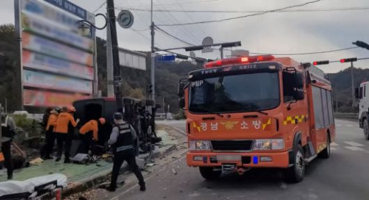 18일 의령경찰서와 경남소방본부에 따르면 이 사고로 승합차가 현장 근처 인도 위에 왼쪽으로 쓰러졌다.
