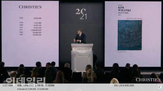 17일(현지시간) 미국 크리스티 뉴욕 경매에서 진행한 ‘20세기 이브닝 세일’에서 김환기의 ‘19-Ⅵ-71 #206’(1971)이 840만달러(약 123억 1776만원)에 낙찰되고 있다(사진=크리스티 뉴욕 경매 캡처). |