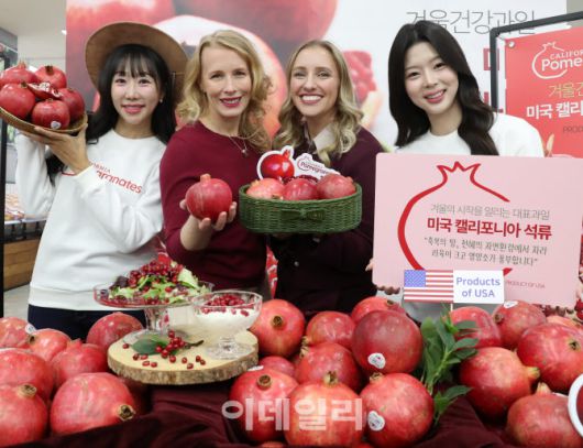 [이데일리 김태형 기자] 18일 롯데마트 제타플렉스 서울역점에서 열린 미국 캘리포니아 석류 출시행사에서 미대사관 농무참사관 켈리 스탱과 농업무역관장 리사 앨런이 모델들과 석류를 홍보하고 있다. 석류는 에스트로겐과 폴리페놀이 풍부해 갱년기 여성 건강과 남성의 전립선 건강관리에 도움이 되는 것으로 알려졌다. 롯데마트는 전매장에서 20일까지 미국산 석류 특재사이즈를 4,990원에 행사가로 판매한다.