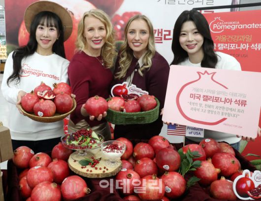 [이데일리 김태형 기자] 18일 롯데마트 제타플렉스 서울역점에서 열린 미국 캘리포니아 석류 출시행사에서 미대사관 농무참사관 켈리 스탱과 농업무역관장 리사 앨런이 모델들과 석류를 홍보하고 있다. 석류는 에스트로겐과 폴리페놀이 풍부해 갱년기 여성 건강과 남성의 전립선 건강관리에 도움이 되는 것으로 알려졌다. 롯데마트는 전매장에서 20일까지 미국산 석류 특재사이즈를 4,990원에 행사가로 판매한다.
