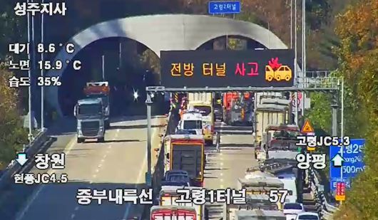 18일 오후 12시 34분경 중부내륙선 고령 2터널(양평방향 58.7㎞) 내 화물차 사고로 화재가 발생해 통행이 전면 차단됐다. 2025.11.18. 로드플러스 갈무리 |