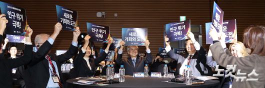 나이영 CBS 사장과 주형환 저출산고령사회위원회 부위원장, 이스란 보건복지부 차관 등 참가자들이 18일 서울 여의도 FKI타워 그랜드볼룸에서 CBS와 보건복지부 주최로 열린 '2025 대한민국 인구포럼 - 새로운 기회와 도전'에서 인구위기 극복 세리머니를 하고 있다.저작권자 © CBS 노컷뉴스 무단전재 및 재배포 금지
