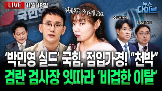 출연: 양지열 변호사, 박영식 시사평론가, 오윤혜 방송인, 신인규 변호사, 권태호 한겨레 논설실장, 진행: 고현준. “기억 안 난다” 시전한 최상목에 이진관 판사 돌직구 / 박민영 “김예지 눈 불편 빼면 기득권” 막말... 국힘 천박한 옹호 / 항소 포기 후폭풍... 검란 검사장들 ‘비겁한 이탈’ / 한강버스 사고 15번 전조... 오세훈은 남 탓만 / 황교안, 김주현과 계엄 날 통화... ‘내란 선동’ 소통 의심 / “전광훈도 우리 응원”... 김용현, 계엄 보고한 합참 차장 질책. 오늘 (11월 18일) 뉴스 다이브 많은 시청바랍니다.