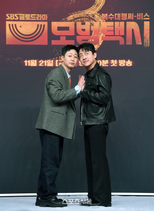 배우 배유람(왼쪽)과 장혁진이 18일 서울 양천구 SBS사옥에서 진행된 SBS 금토드라마 ‘모범택시3’ 제작발표회에서 취재진을 향해 포즈를 취하고 있다. 2025. 11. 18.박진업 기자 upandup@sportsseoul.com [기사제보 news@sportsseoul.com] Copyright ⓒ 스포츠서울&sportsseoul.com