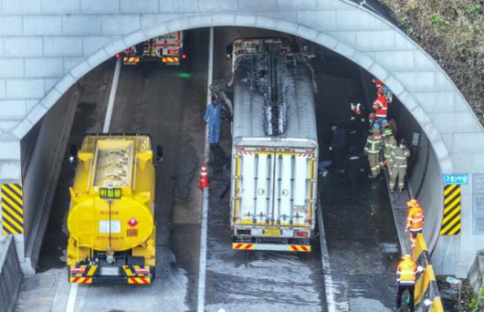 18일 경북도소방본부에 따르면 이날 낮 12시 34분쯤 경북 고령군 성산면 오곡리 중부내륙고속도로 양평 방향 58㎞ 지점 고령2터널 안에서 화물차 3대가 잇따라 추돌하며 이 중 5톤 트럭 1대가 전소했다.