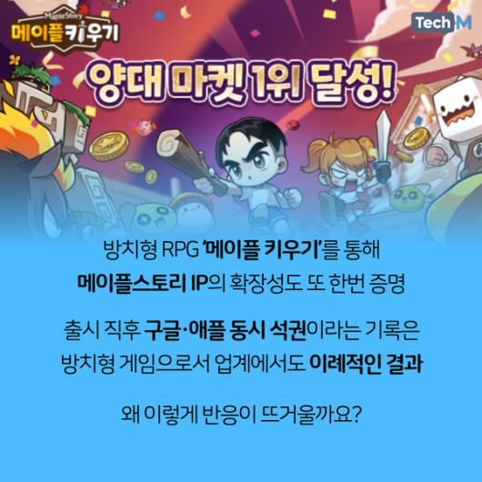 동시에 넥슨의 신작 모바일 방치형 RPG '메이플키우기'가 국내 구글플레이 및 애플 앱스토어 등 양대 모바일 마켓에서 매출 1위를 달성하며 승승장구 하고 있다. 넥슨의 인기 IP인 '메이플스토리'를 기반으로 한 이 게임은 메이플 IP 확장과 장르 다각화를 성공적으로 구현해냈다는 평가다.