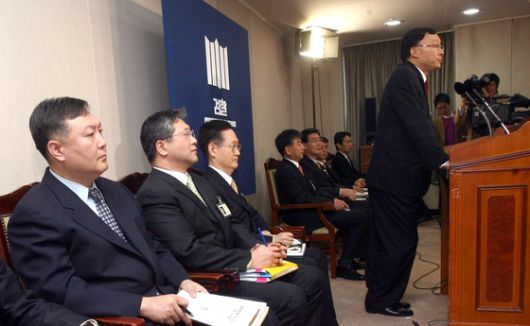 2003년 3월 11일 SK 1차 수사 결과 발표 기자회견장에서의 한동훈(맨 왼쪽)과 이동열(왼쪽 세번째). 두 사람은 서울지검 형사9부에 함께 몸담으면서 SK 1차 수사 성공에 크게 일조했다. |