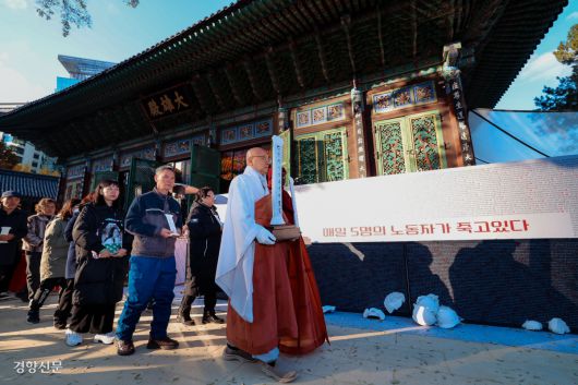 18일 서울 종로구 조계사에서 열린 산재사망 희생자 추모 위령제에서 유가족들이 희생자의 이름이 적힌 종이를 태우는 소전 의식을 위해 위패를 들고 이동하고 있다. 이날 위령제는 희생자 155명의 위패를 모신 가운데 ‘안전하고 차별 없는 일터 기원’을 주제로 진행됐다.