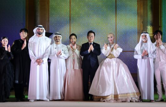 아랍에미리트(UAE)를 국빈 방문한 이재명 대통령과 부인 김혜경 여사(왼쪽 다섯째)가 18일(현지시간) UAE 대통령궁에서 열린 문화행사 ‘문화, UAE와 한국을 잇다’에서 참석자들과 기념사진을 찍고 있다. 오른쪽 셋째는 소프라노 조수미.