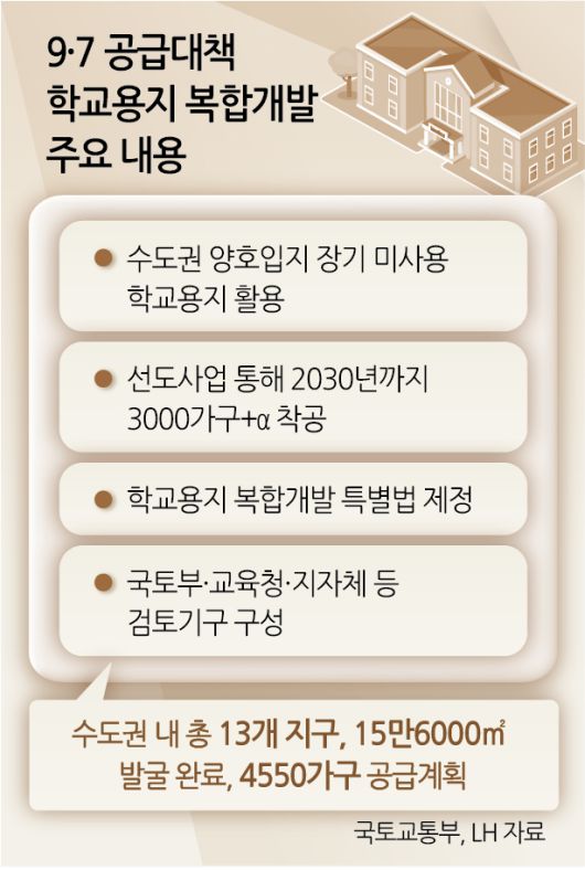 정부는 9·7 주택공급 확대방안 내용으로 도심 내 학교, 미사용 학교용지, 폐교부지 등에 공공주택, 교육시설, 생활사회기반시설(SOC)을 복합개발해 2030년까지 수도권 3000가구+α를 착공하겠다고 제시한 바 있다. 미사용 학교용지는 그간 용도전환 여부를 놓고 교육청, 지자체, 정부, LH, 지역주민 등 각 주체간 이견이 지속된 갈등 사안이었다. 이러한 구조적 충돌을 해소하고 수도권 주택공급에 활용될 수 있도록 ‘학교용지 복합개발 특별법’(가칭)을 제정해 후보지를 발굴하고 체계적 추진기반을 마련한다는 게 정부의 구상이다. 당시 정부는 국토교통부 주관, 교육청·지자체·전문가 등으로 검토기구를 구성하겠다는 계획도 담았다.