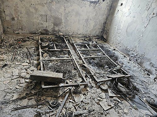 (니르 오즈 키부츠=연합뉴스) 이귀원 기자 = 지난 11일(현지시간) 촬영한 하마스의 공격으로 불에 탄 니르 오즈 키부츠의 가옥 모습. 뼈대만 남은 침대가 당시의 참혹한 비극을 말해주고 있다. 2025.11.19