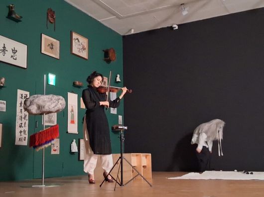 지난달 23일 코리아나미술관 지하 2층 전시장에서 진행된 이완 작가의 개인전 개막 퍼포먼스 모습. 바이올리니스트 백경씨의 연주로 안무가 이재윤씨가 전통 탈춤의 춤사위를 재해석한 몸짓극을 벌이고 있다. 백 연주자 뒤로 이완 작가의 벽면 설치 작업 ‘거대한 뿌리’가 보인다. 노형석 기자 |