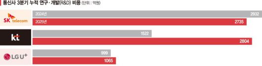 19일 금융감독원 전자공시시스템에 따르면 올해 1·4분기부터 3·4분기까지 누적된 통신 3사의 R&D 비용은 약 6604억원이다.