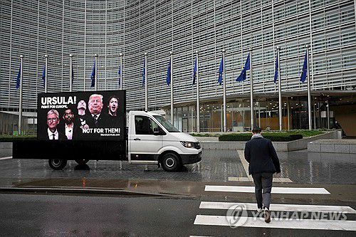 인공지능(AI) 등 디지털 규제 완화에 항의하는 간판을 실은 차량이 19일 브뤼셀 EU 본부 앞에 등장했다. [AFP 연합뉴스 자료사진. 재판매 및 DB 금지] |