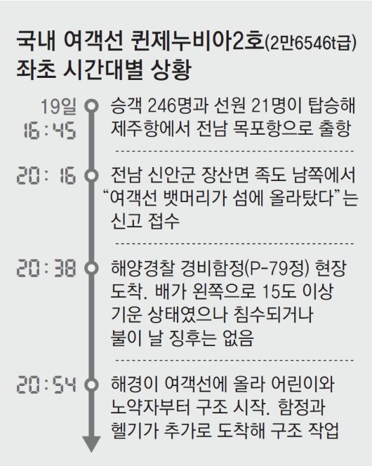 19일 전남 신안군 무인도에 좌초된 2만6546t급 국내 여객선 퀸제누비아2호의 탑승객 김모 씨(41)는 구조 직후 동아일보와의 통화에서 사고 당시 다급한 상황을 이렇게 설명했다. 김 씨는 “선실에 누워 있는데 충격에 몸이 뒤로 밀렸고, 밖에선 고함이 들렸다”며 “나가 보니 매점 물건은 다 엎어져 있었고 아이가 울고 있었다”고 했다.