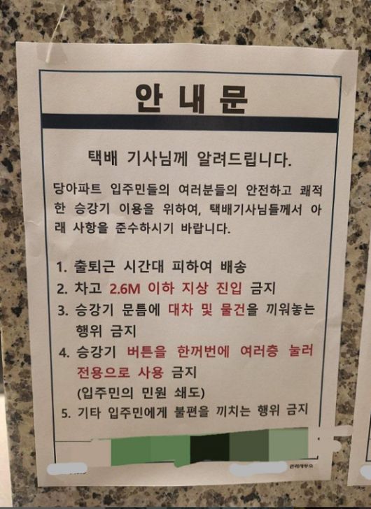 구체적으로는 ▲출퇴근 시간대의 배송 자제 ▲차고 2.6m 이하 차량의 지상 진입 금지 ▲승강기 문틈에 대차 및 물건을 끼워놓는 행위 금지 ▲여러층 버튼을 동시에 눌러 엘리베이터를 전용으로 사용하는 행위 금지 ▲입주민에게 불편을 끼치는 기타 행동 금지 등이 포함됐다.