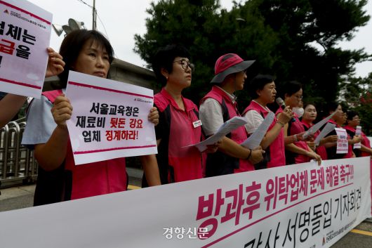 전국학교비정규직노동조합 서울지부 조합원들이 11일 서울시교육청 앞에서 방과후 위탁업체 문제 해결을 촉구하는 기자회견을 열고 있다.2025.08.11 문재원 기자 |
