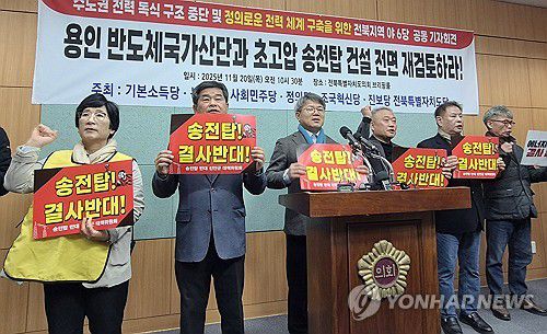 (전주=연합뉴스) 임채두 기자 = 기본소득당·녹색당·사회민주당·정의당·조국혁신당·진보당의 전북특별자치도당은 20일 "용인 반도체 산업단지와 초고압 송전탑 건설을 즉각 중단하라"고 촉구했다.
