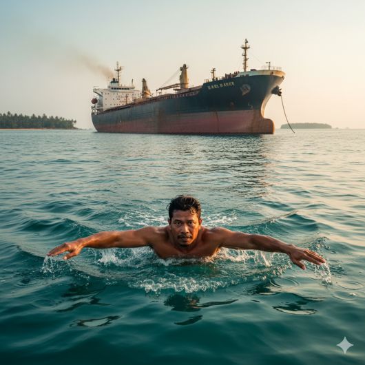 배가 남외항 일대에 정박하자 A 씨는 선박 뒷부분에서 로프를 잡고 바다에 뛰어들었다. 이어 2시간 30분간 바다를 헤엄쳐 방파제에 도달했다.