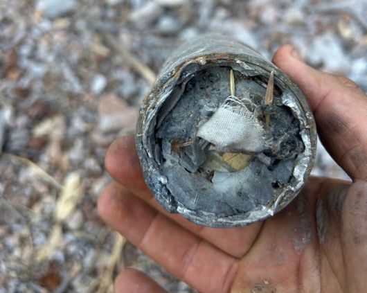 라암 에이탄 집속탄의 잔해. 표면에 그려진 황색 다이아몬드 표시는 고폭 자탄이 실려 있다는 사실을 표기하는 데 사용되는 기호다. 출처 가디언 |