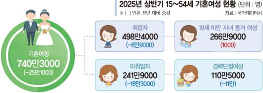20일 국가데이터처가 발표한 '2025년 상반기 지역별 고용조사 기혼 여성의 고용 현황'에 따르면 15~54세 기혼 여성(740만3000명) 중 취업자는 498만4000명으로 집계됐다. 이들의 고용률은 67.3%로 전년 대비 1.3%p 증가했다. 미성년 자녀와 함께 사는 15~54세 기혼 여성의 고용률은 64.3%로 전년보다 1.9%p 올랐다. 이는 2016년 관련 통계가 집계되기 시작한 이후 최고치였던 지난해 기록을 단 1년 만에 다시 경신한 것이다.