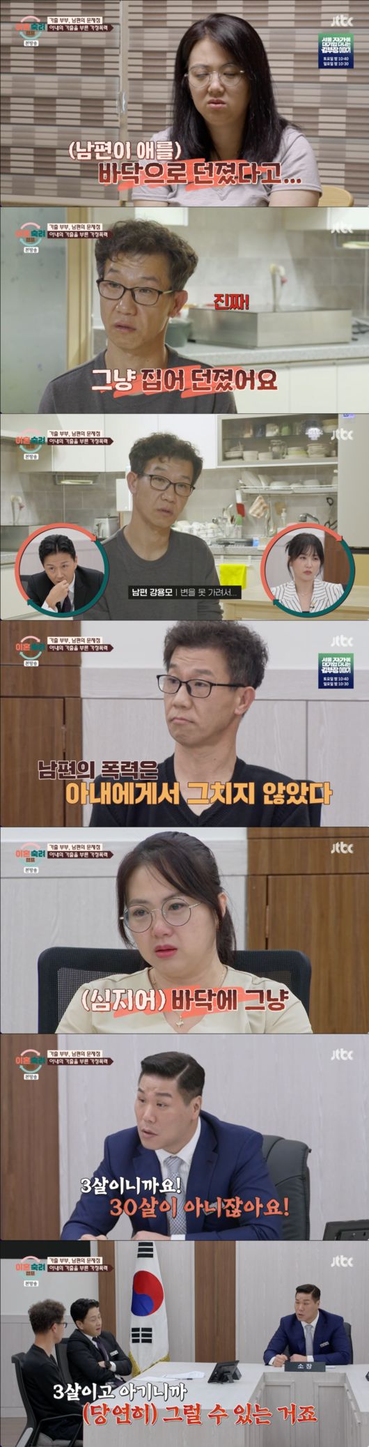 3살짜리 아기를 '변을 못 가려서' 던졌다는 남편의 비인간적인 행동과 변명에 MC들은 격분했다. 특히 서장훈은 분노를 참지 못하고 "3살이고 아기니까 그럴 수 있는 거죠!"라고 일갈하며 남편의 잔혹함을 맹렬히 비판했다.