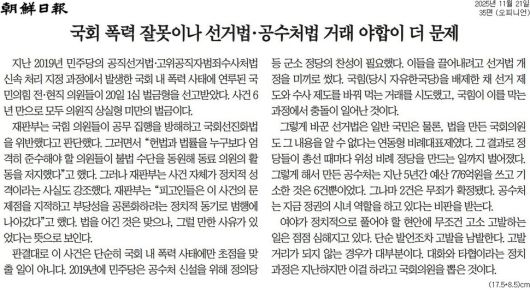 조선 = 국회 폭력 잘못이나 선거법·공수처법 거래 야합이 더 문제