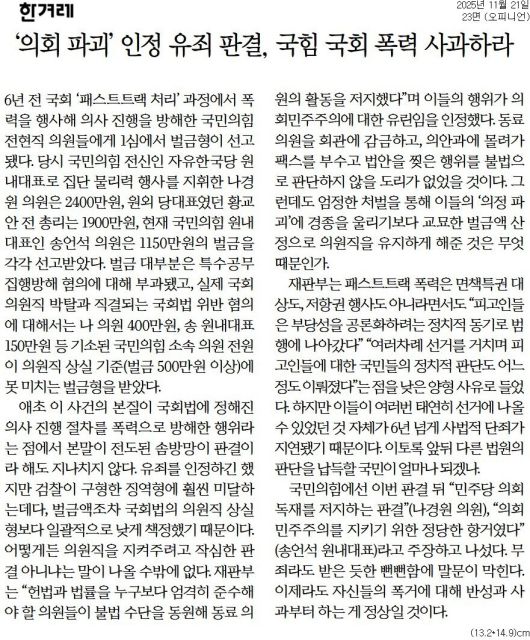 한겨레 = '의회 파괴' 인정 유죄 판결, 국힘 국회 폭력 사과하라
