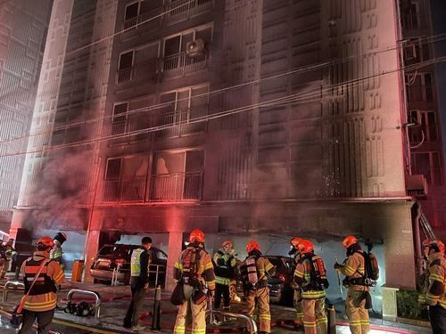 소방당국은 오전 5시44분에 대응 1단계를 발령하고 오전 6시59분쯤 큰 불길을 잡았다. 불은 세대로 번지지는 않았지만 주차돼 있던 차량 18대를 모두 태웠다.