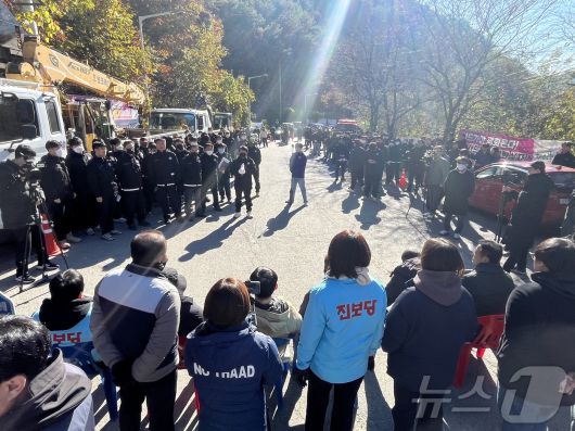 (성주=뉴스1) 공정식 기자 = 경북 성주군이 사드(THAAD·고고도 미사일 방어체계) 기지 인근 반대 단체의 시설물에 대한 행정대집행을 앞두고 21일 오전 기지 입구 진밭교 주변에 시민사회단체 회원들이 대치하고 있다. 2025.11.21/뉴스1kimjy@news1.krCopyright ⓒ 뉴스1. All rights reserved. 무단 전재 및 재배포, AI학습 이용 금지.