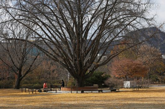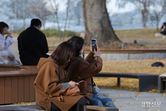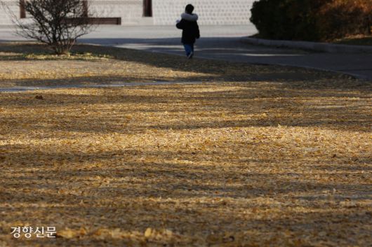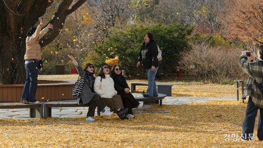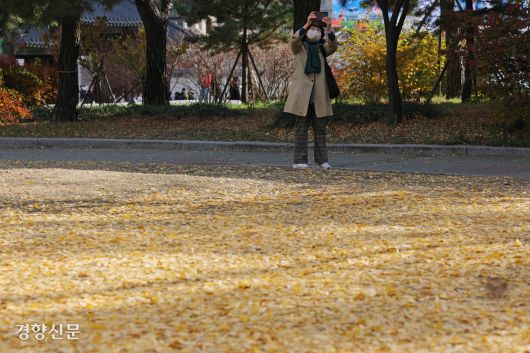 21일 서울의 낮 기온은 15도 안팎까지 올라 평년보다 온화한 날씨를 보였다. 이날 서울 종로구 국립고궁박물관을 찾은 시민들은 바닥을 가득 메운 은행잎을 배경으로 마지막 가을 추억을 쌓았다.