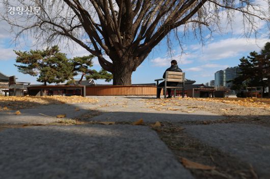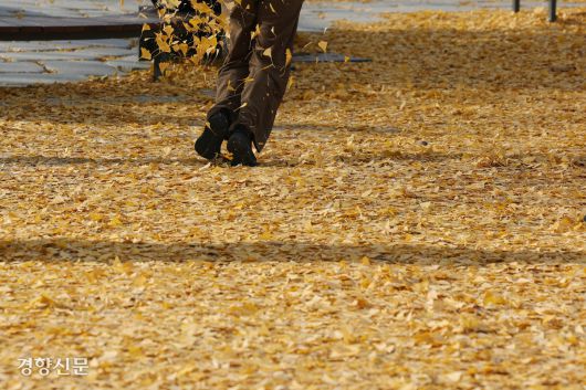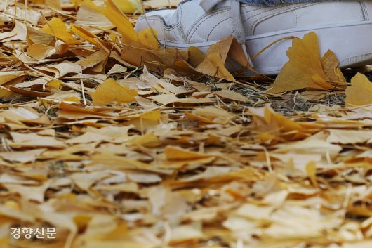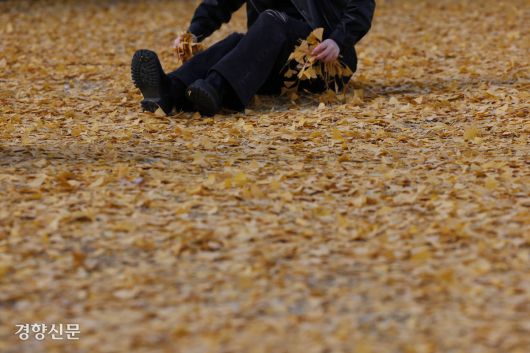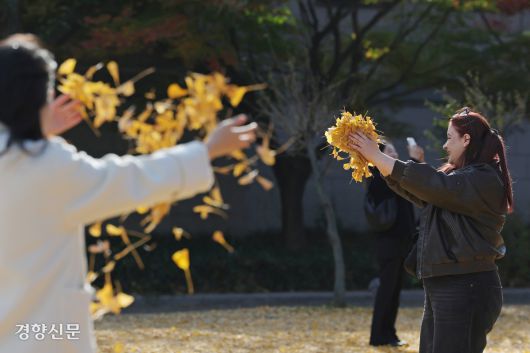 21일 서울 종로구 국립고궁박물관을 찾은 시민들이 떨어진 은행잎을 주워 던지고 있다. 정효진 기자 |