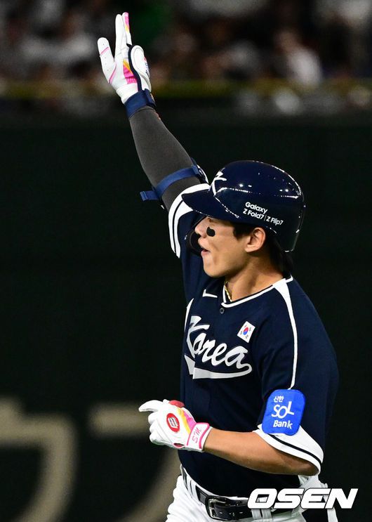 [OSEN=도쿄(일본), 조은정 기자] 한국 야구 대표팀이 한일전 첫 번째 경기에서 뼈아픈 역전패를 허용했다. 2023년 WBC(월드베이스볼클래식)에 이어서 또 한 번 마운드의 차이를 여실히 느꼈다.한국은 15일 일본 도쿄도 도쿄돔에서 열린 ‘2025 NAVER K-BASEBALL SERIES’ 일본과의 1차전에서 4-11역전패를 당했다. 이날 패배로 한국은 성인 대표팀 경기에서 2015년 프리미어12 준결승 4-3 승리 이후일본에 10연패(아시안게임 제외)를 당하고 말았다.4회초 무사에서 대한민국 송성문이 안현민의 선제 투런포에 이어 백투백 우월 솔로포를 날린 뒤 베이스를 돌고 있다. 2025.11.15 /cej@osen.co.kr |