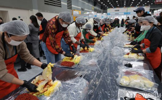 [서울=뉴스핌] 이길동 기자 = 김치의 날인 22일 서울 서초구 양재동 aT센터 열린 ' 2025 대한민국 김장대축제' 대한민국 김치명인과 함께하는 김치담그기 행사에서 다문화 가족, 외국인 명예시민 등 참가자들이 김치을 담그고 있다. 2025.11.22 gdlee@newspim.com